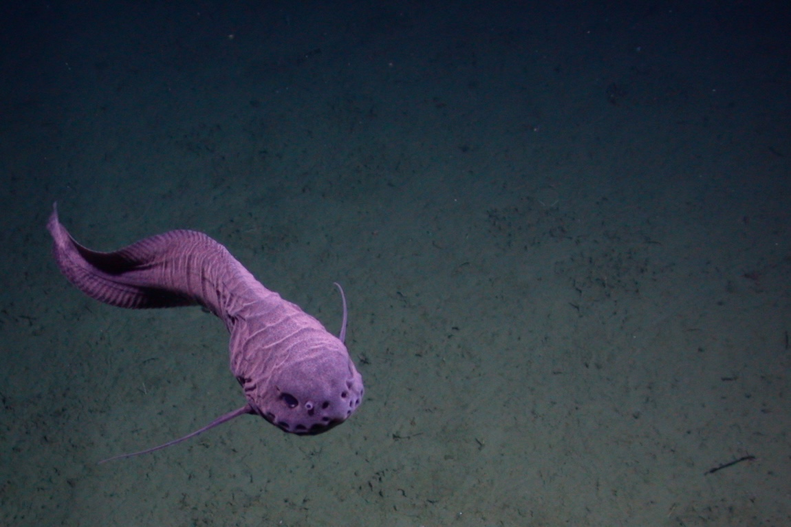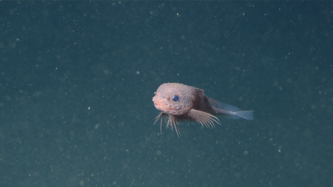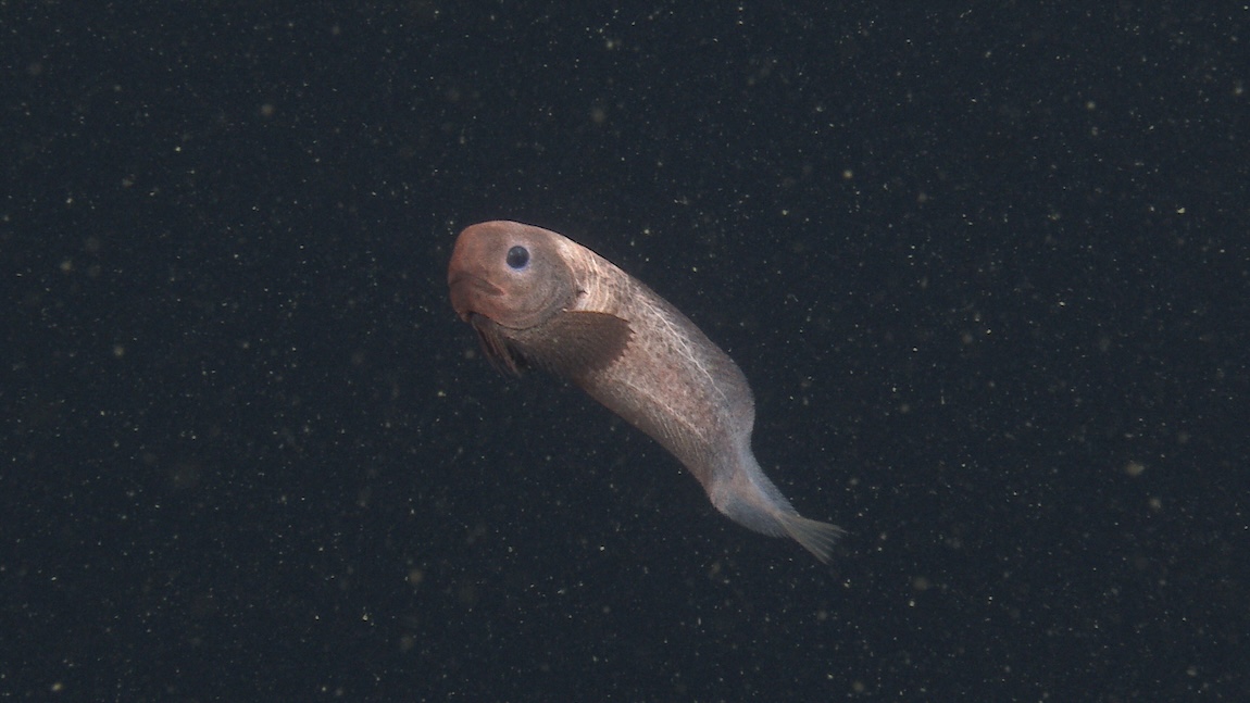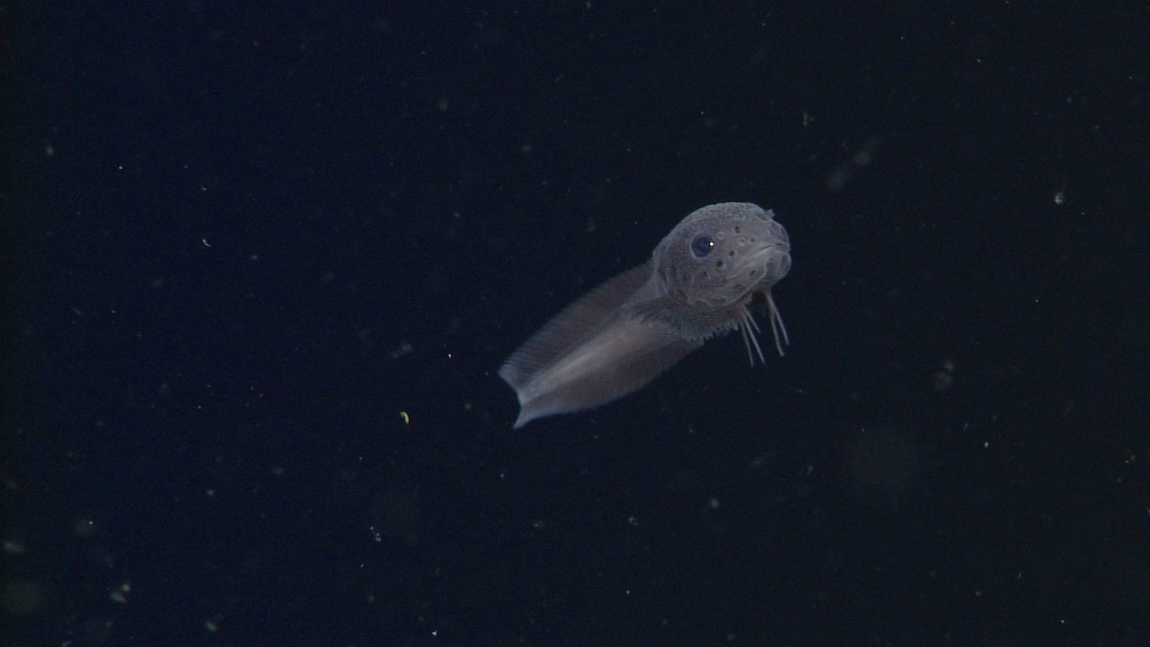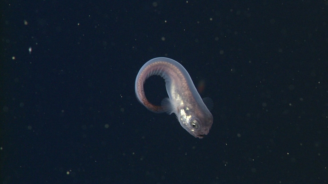While most snailfishes live near the seafloor, the tadpole snailfish (Nectoliparis pelagicus) lives in the midwater, an expanse of open water deep below the surface, yet far above the seafloor. We occasionally come across this little snailfish drifting in the water column, curled into a doughnut shape.