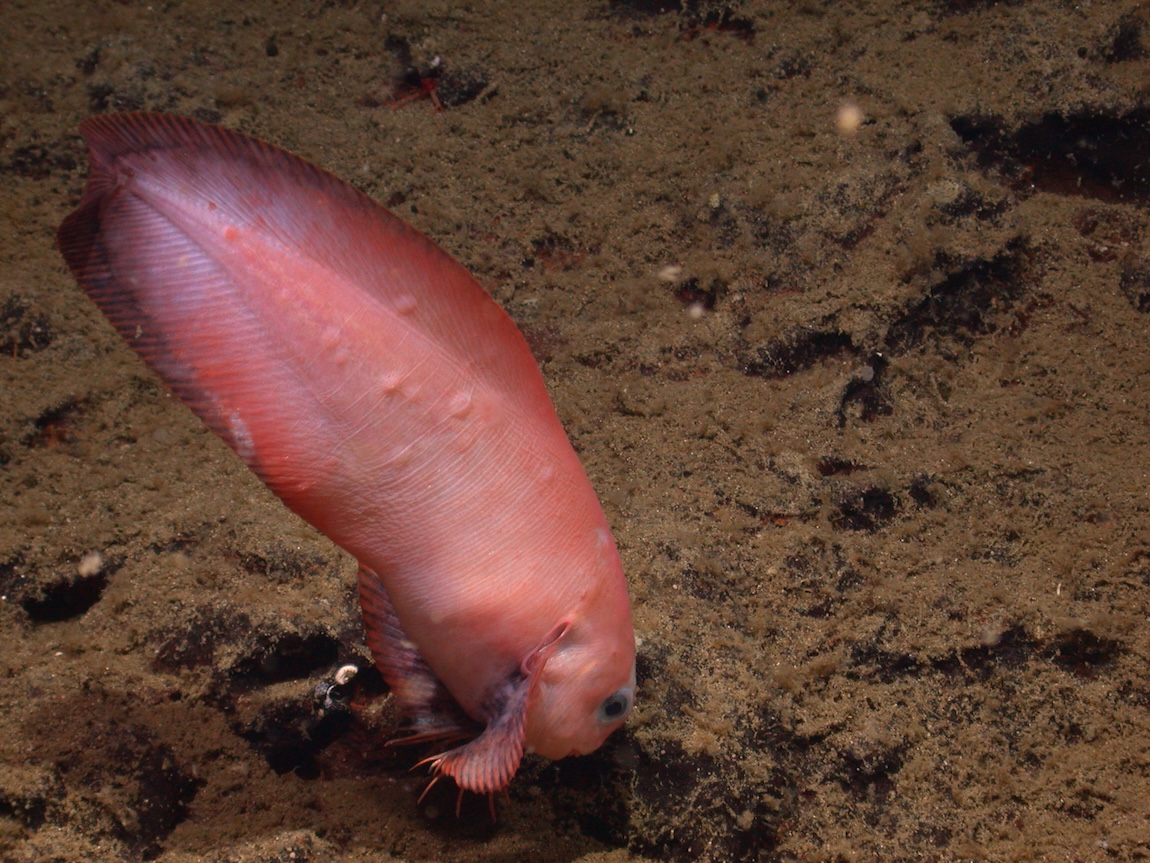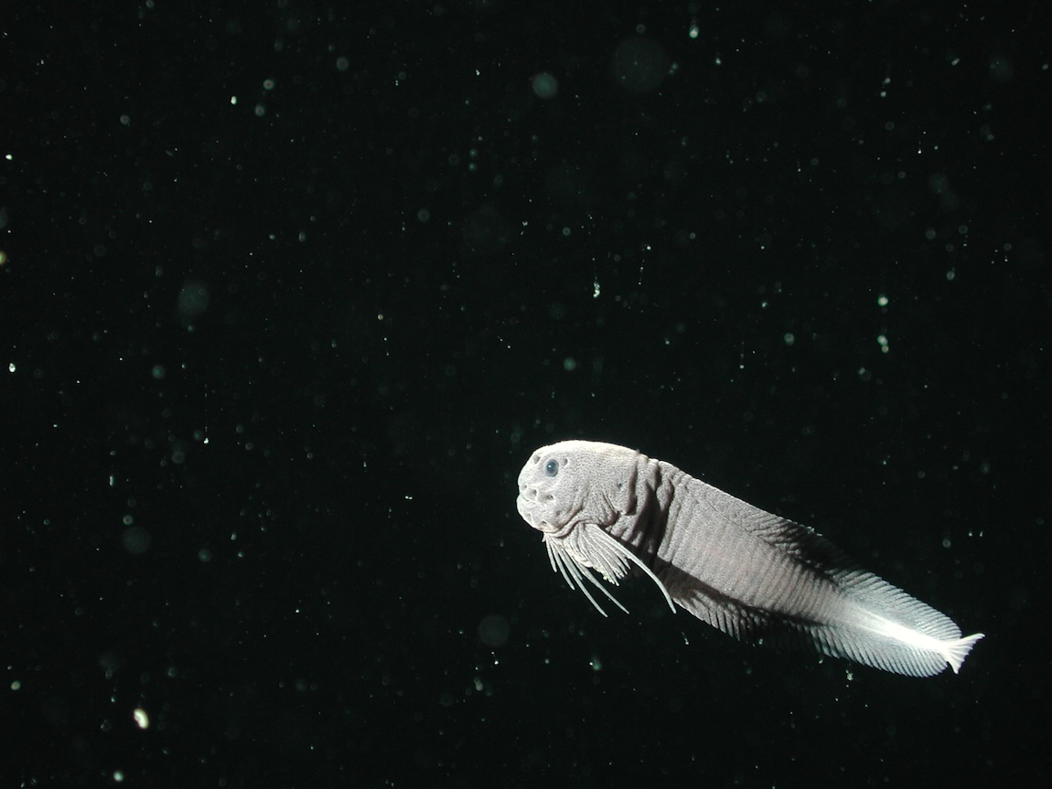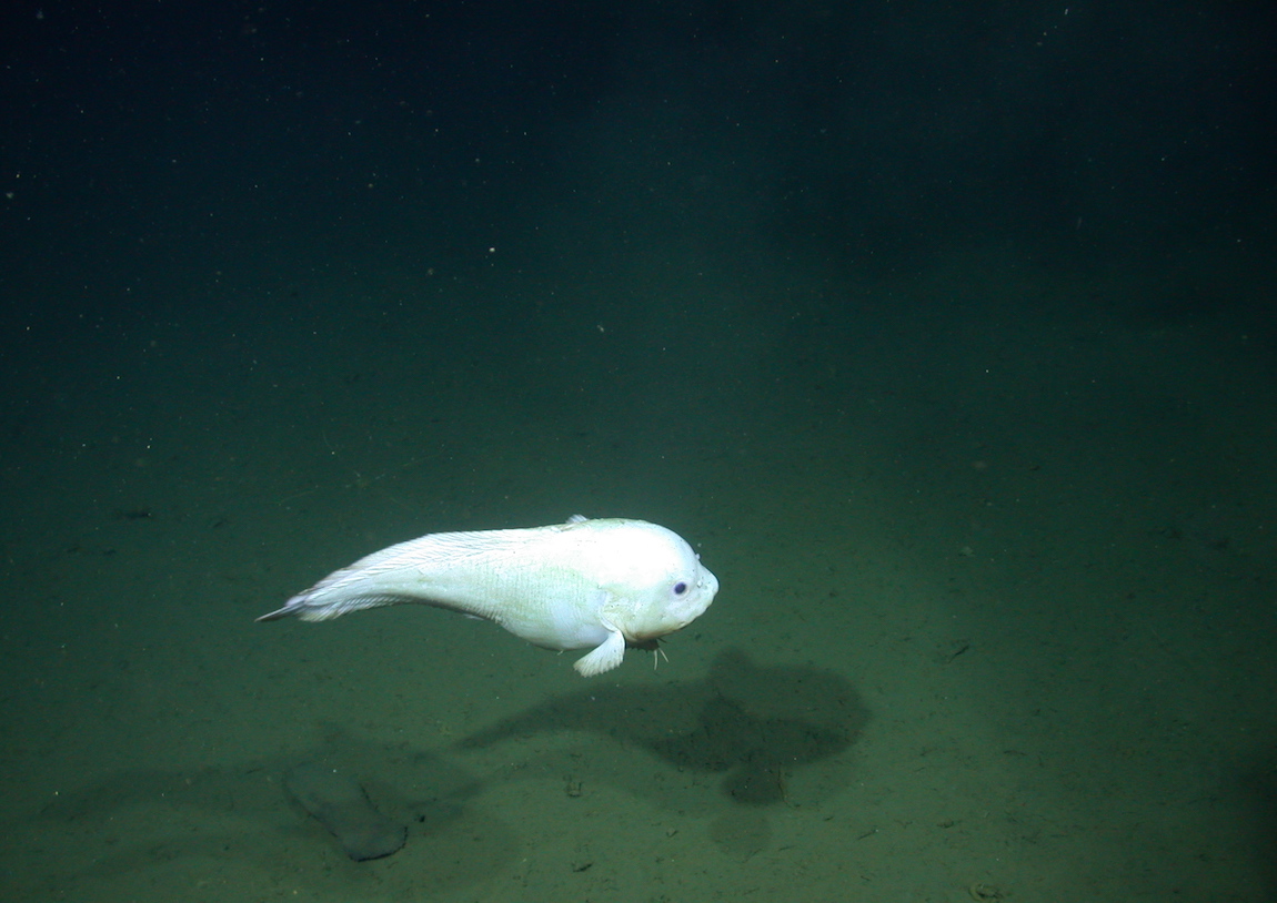 MBARI has encountered more than a dozen snailfish species in our explorations of the deep waters of the Northeastern Pacific. We see the blacktail snailfish (Careproctus melanurus) most frequently. This pink species with a distinctive dusky tail is common on the muddy slopes around Monterey Canyon. In the canyon’s deepest stretches, the snowy-white abyssal snailfish (Careproctus ovigerus) is more abundant.