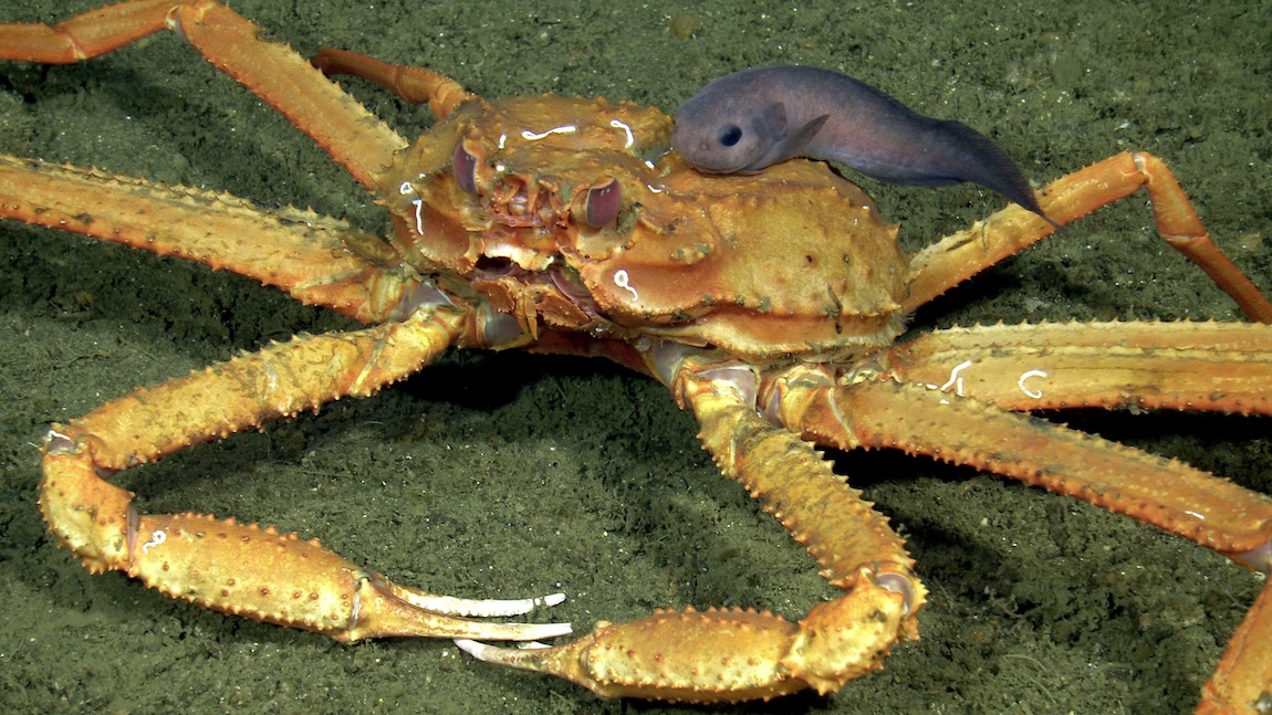 Scientists have described more than 450 different species of snailfish worldwide. Snailfishes have a large head, a jelly-like body covered in loose skin, and a narrow tail. Many have fins on their belly modified into a disk that can hold on tight to rocks, seaweed, or even larger animals like deep-sea crabs for shelter. Most are small and feed on tiny invertebrates.