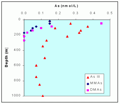 Concentration profiles of As(III), methylarsonate (MMAs) and dimethylarsinate (DMAs) in the Atlantic.