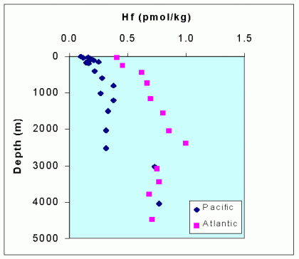 Graph shows the concentration of hafnium at various depths in the Pacific Ocean and the Atlantic Ocean.