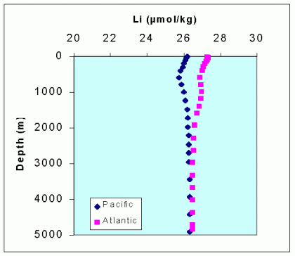 Graph shows the amount of lithium calculated to be present at various depths in the Pacific Ocean and the Atlantic Ocean using the observed salinity profiles.
