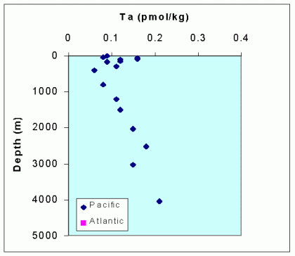 Graph shows the concentration of tantalum at various depths in the Pacific Ocean.